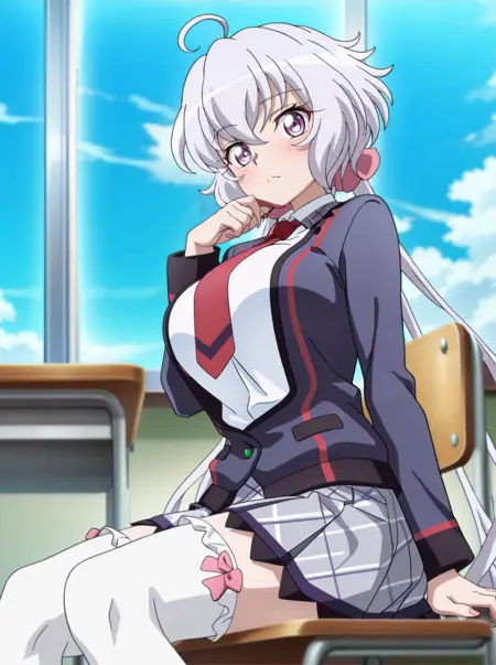Lydian Academy Uniform: necktie, school uniform, pleated skirt, , white thighhighs, , blue_blazer white_Shirt