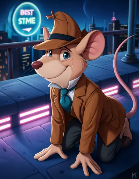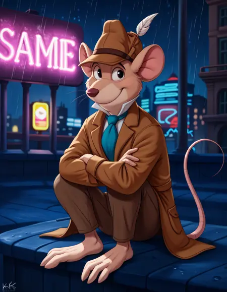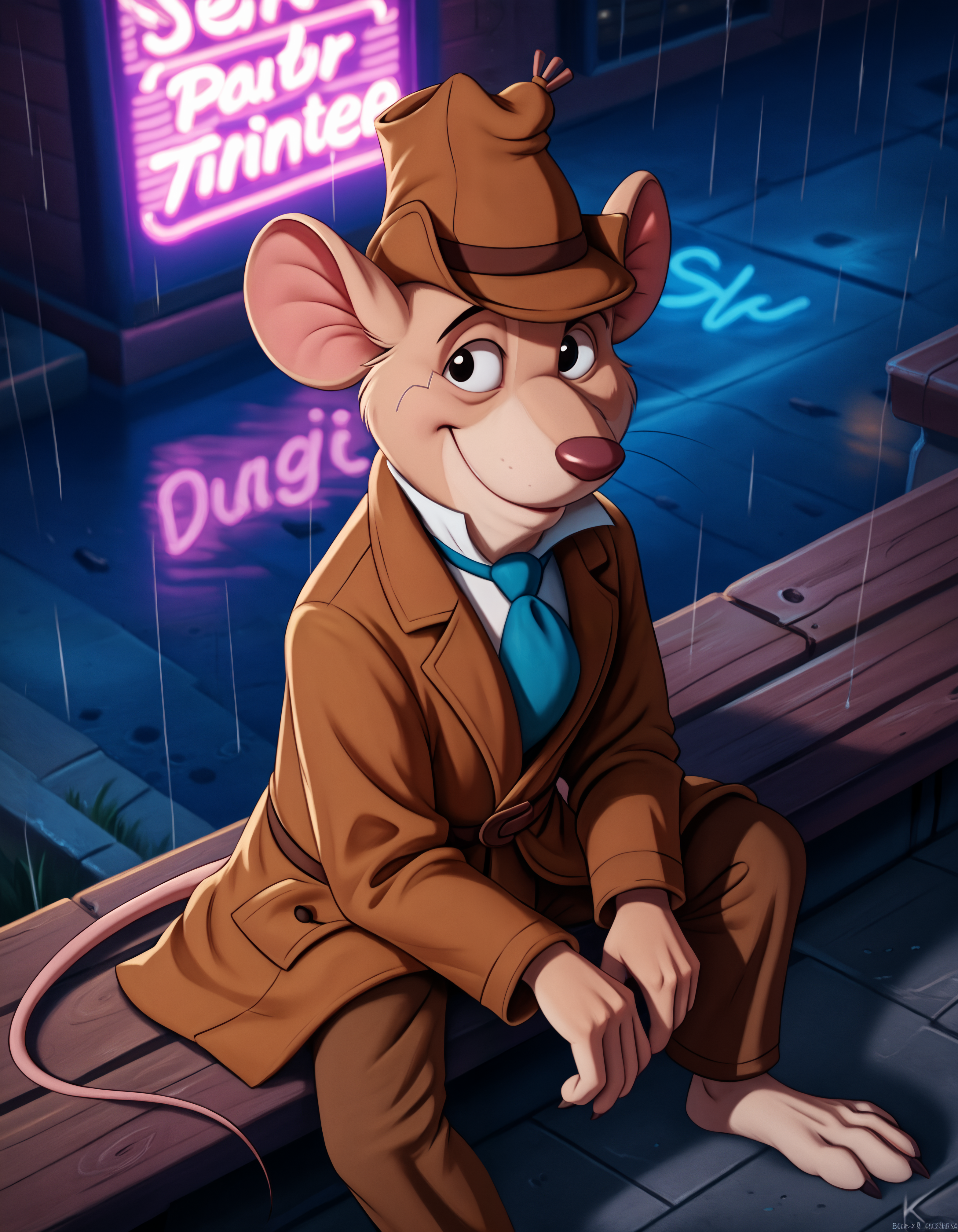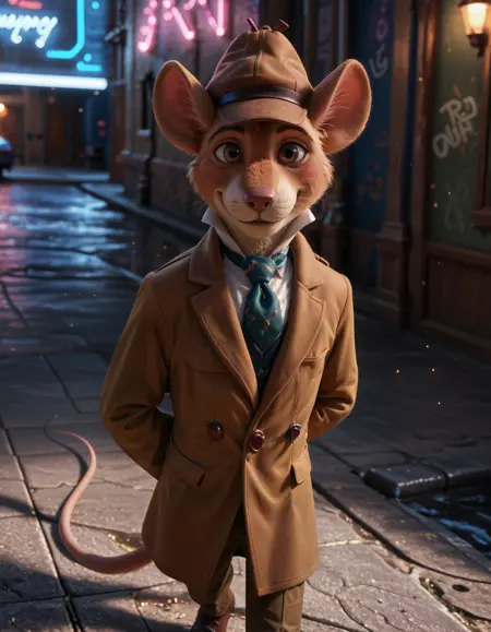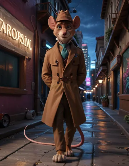 basil_gmd, great_mouse_detective, solo, 1boy, male focus, clothed, hat, long_sleeves, tail, necktie, shoes, pants, black_eyes, coat, blue_necktie, mouse_ears, brown_headwear, furry_male, mouse_tail, brown_pants, brown_coat, mouse, trench_coat, detective