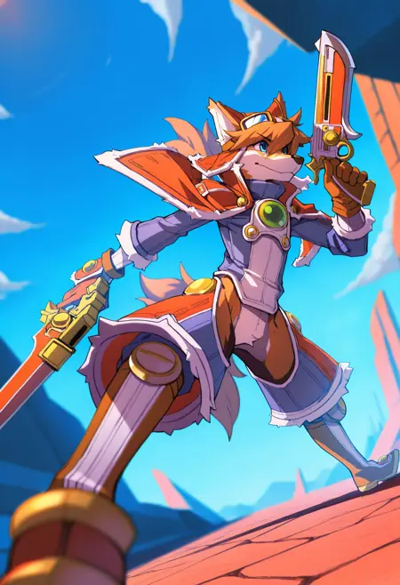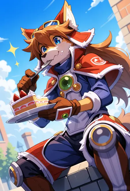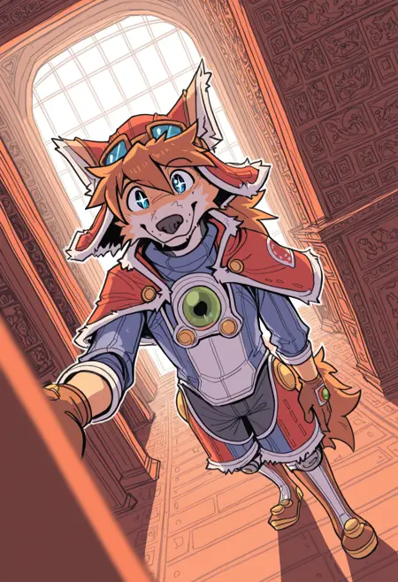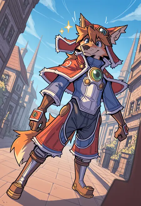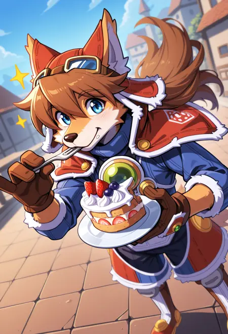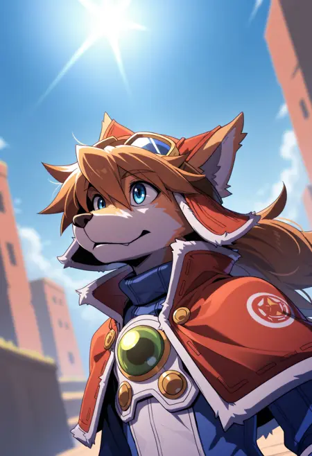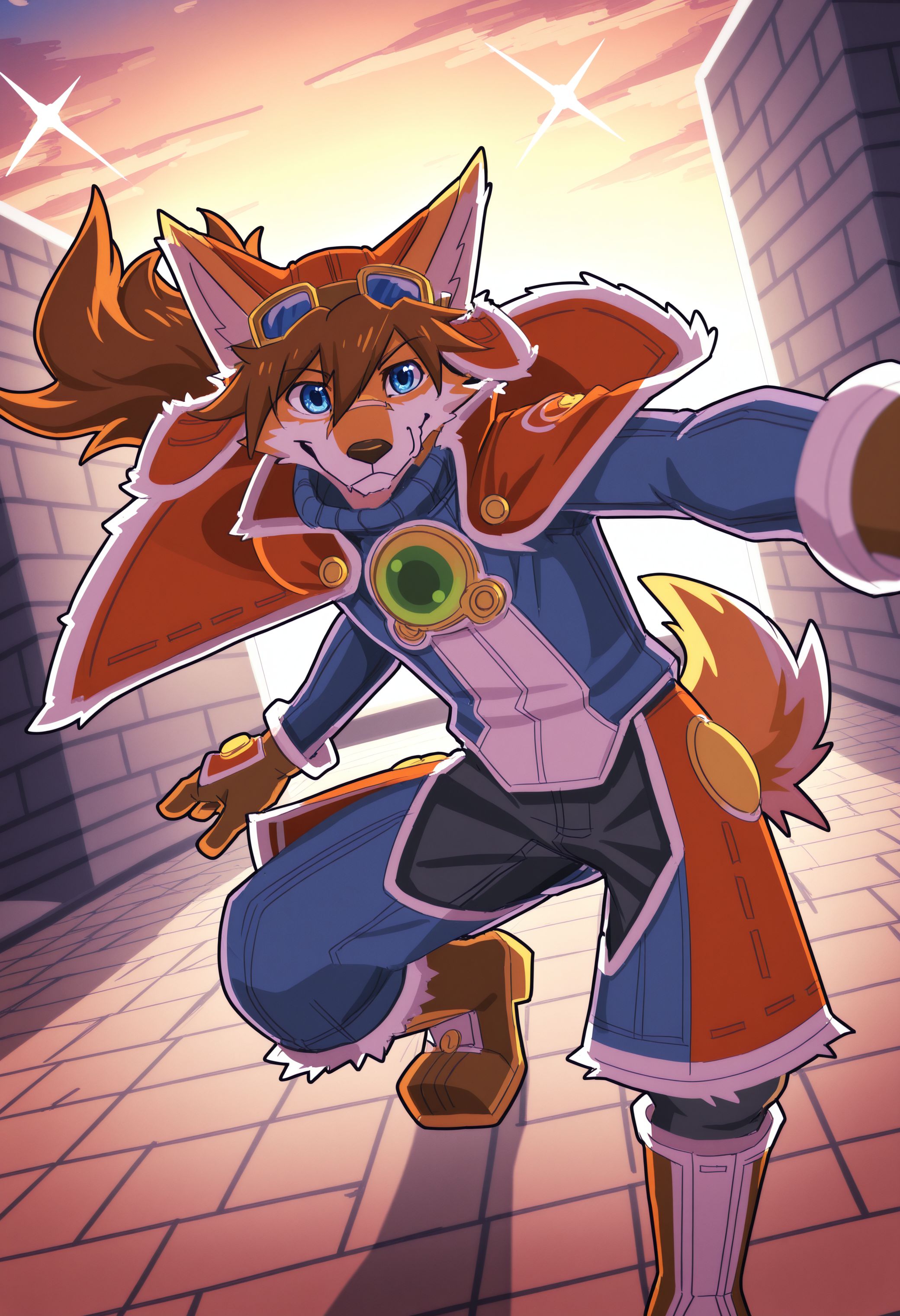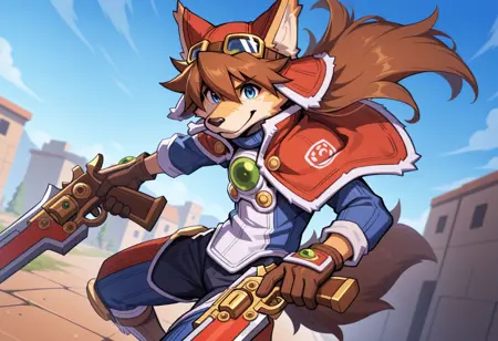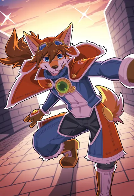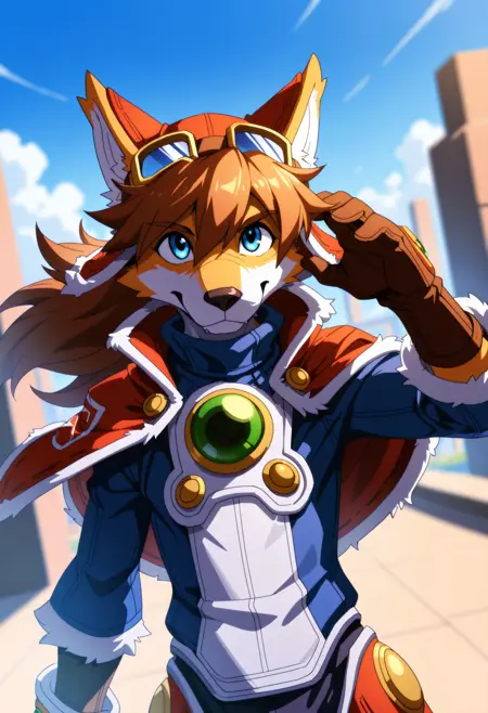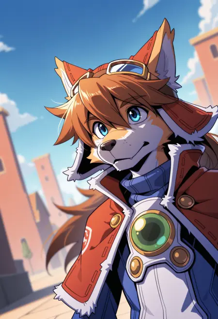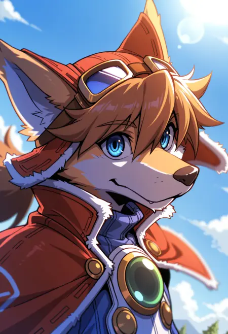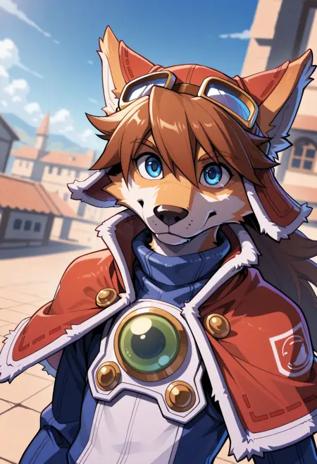 Pony: score_9, score_8_up, score_7_up, high res, best quality, red_savarin_solatorobo, furry, goggles, solo, 1boy, blue eyes, brown hair, gloves, capelet, ...your tags...