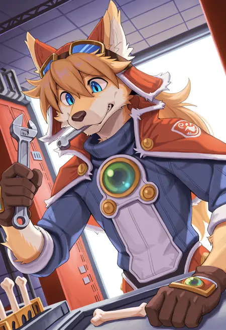 Illustrious: best quality, amazing quality, very aesthetic, absurdres, newest, red_savarin_solatorobo, furry, furry male, solo, 1boy, goggles, blue eyes, looking at viewer, ...your tags...
