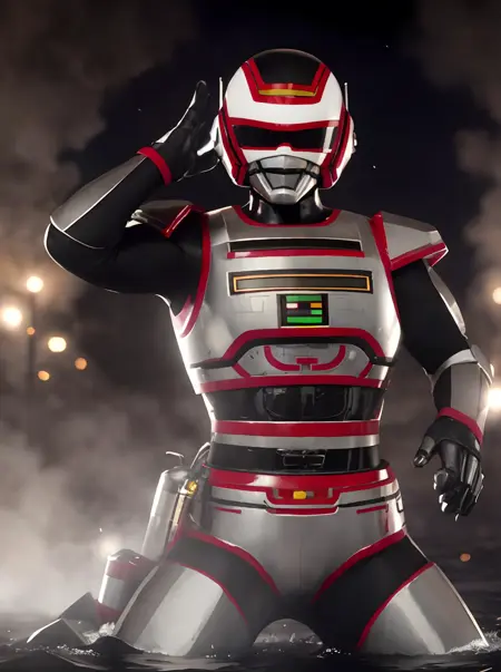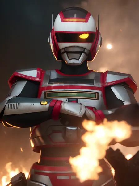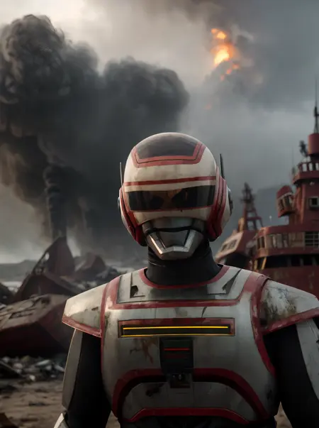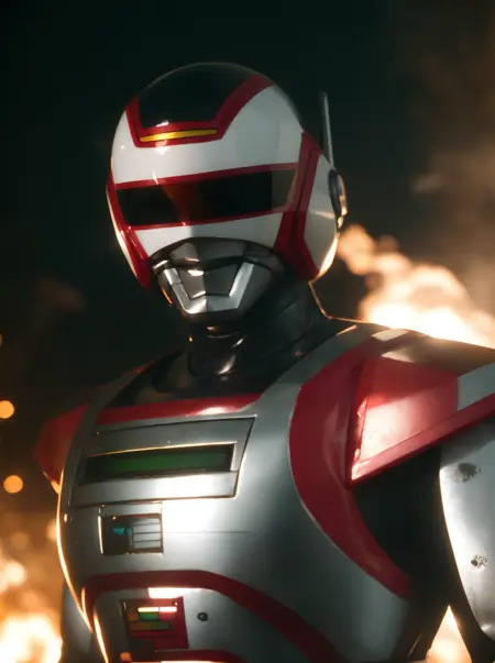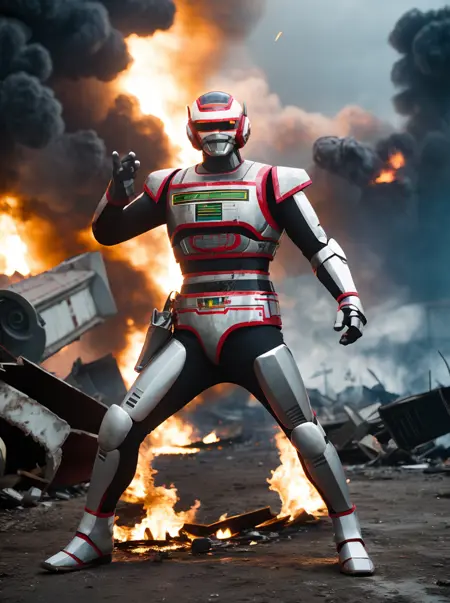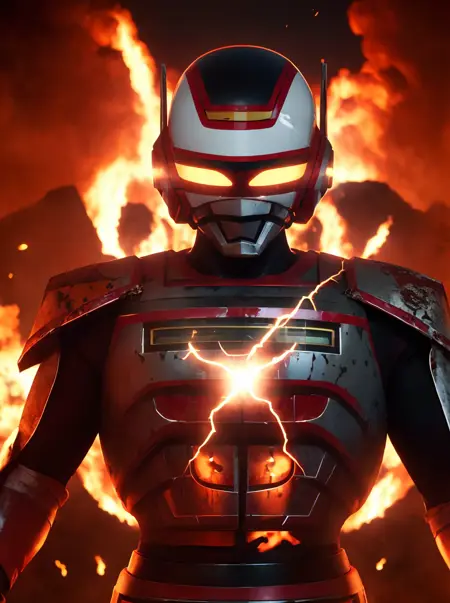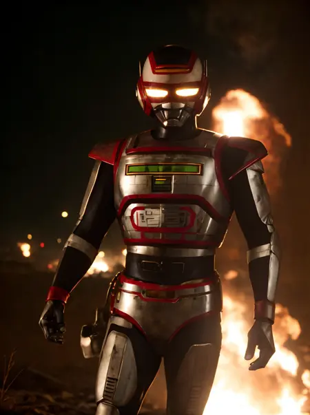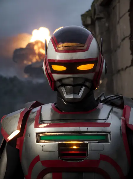 cinematic film still lora:quiron_Jaspion_v3_Lora:0.87 JaspionQuiron キャラクターが地下抵抗組織の隠れ家、反乱軍基地で、抑圧との戦いに挑む、アクションヒーローのポーズ、恐ろしいシーン、火と爆発、霧、稲妻、大災厄、光沢のあるアーマー、浅い被写界深度、バーチェット、非常に詳細、高予算のハリウッド映画、ボケ、シネマスコープ、ムーディー、壮大、美しい、フィルム粒状、粒状