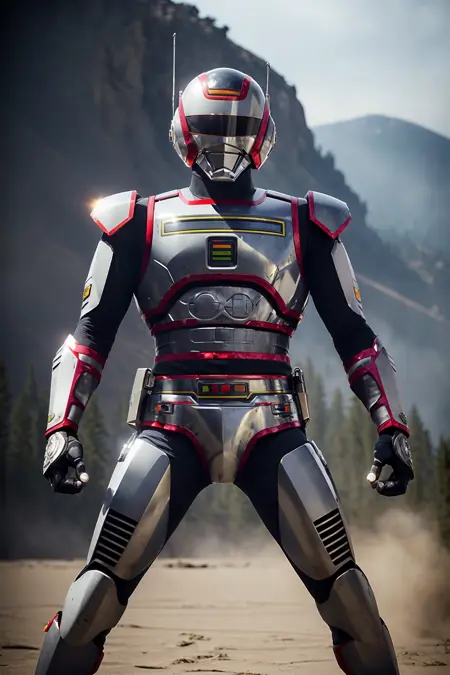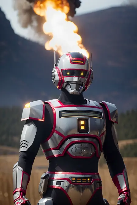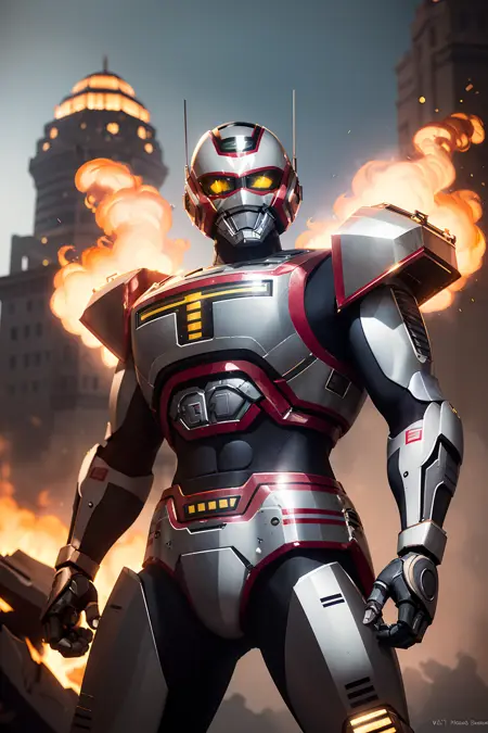 cinematic film still lora:quiron\_Jaspion\_v3\_Lora:0.87 JaspionQuiron character at underground resistance hideout, rebel base, hidden operations, fight against oppression, action hero pose, fearful scene, fire and explosion, fog, lightning, Doomsday, shiny armor, . shallow depth of field, vignette, highly detailed, high budget Hollywood movie, bokeh, cinemascope, moody, epic, gorgeous, film grain, grainy