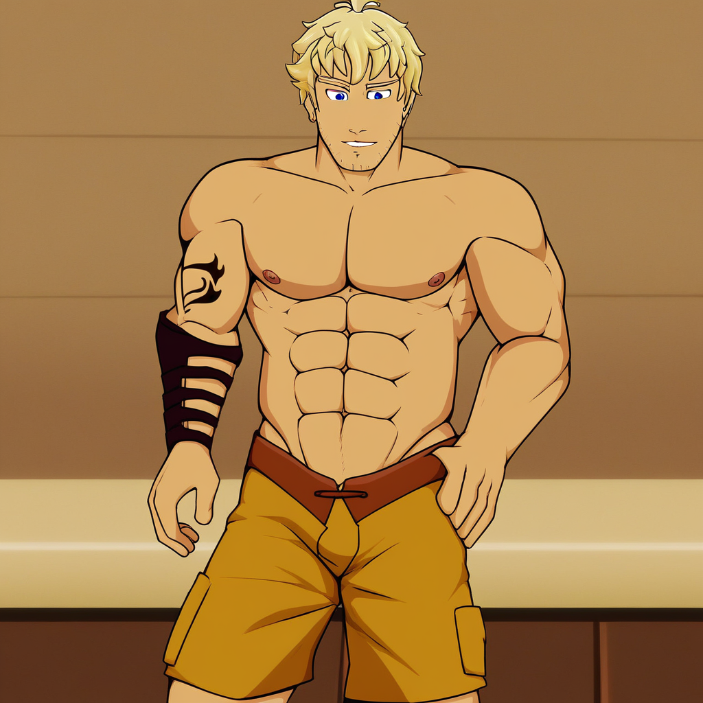 Taiyang Xiao Long, Blonde Hair, Facial Hair, Blue Eyes, Tattoo, Stubble