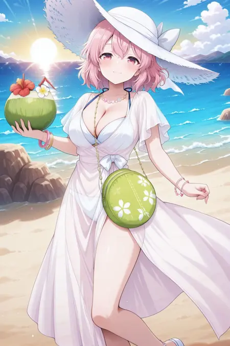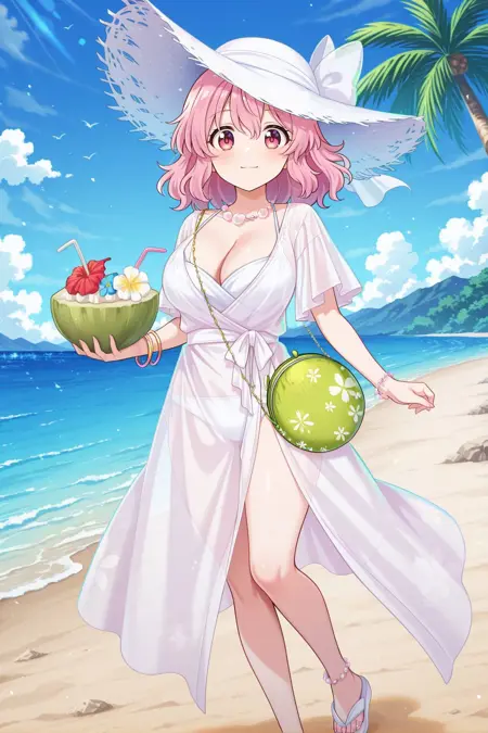 saigyouji yuyuko, 1girl, solo, pink eyes, pink hair, short hair, large breasts, saigyouji yuyuko \(seamless swimsuit ghost\), alternate costume, alternate headwear, white hat, straw hat, hat bow, white bow, bikini under clothes, swimsuit, white bikini, white dress, see-through dress, short sleeves, cleavage, bracelet, necklace, white sandals, coconut cup, green bag,