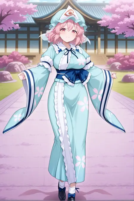 saigyouji yuyuko, 1girl, solo, pink eyes, pink hair, short hair, large breasts, saigyouji yuyuko \(ghost girl in the netherworld tower\), alternate costume, alternate headwear color, aqua hat, triangular headpiece, mob cap, aqua kimono, cherry blossom print, floral print, frilled kimono, long sleeves, sleeve garter, sash, blue ribbon, white socks, black shoes,