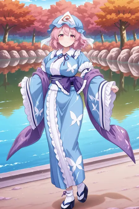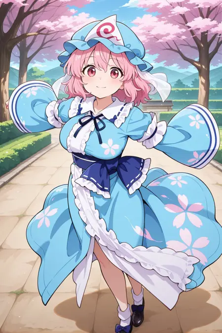 saigyouji yuyuko \(tiny ghost mistress\), adapted costume, blue hat, triangular headpiece, mob cap, neck ribbon, blue kimono, frilled kimono, floral print, long sleeves, wide sleeves, purple apron, butterfly print, white socks, black sandals,