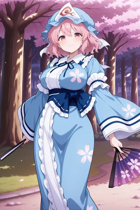 saigyouji yuyuko, 1girl, solo, pink eyes, pink hair, short hair, medium large breasts,