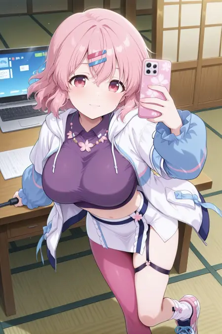 saigyouji yuyuko \(cyber ghost\), alternate costume, hairclip, white hoodie, hood up, long sleeves, puffy long sleeves, white sleeves, pocket, crop top, purple top, midriff, white skirt, miniskirt, asymmetrical legwear, uneven legwear, pink pantyhose, single leg pantyhose, white socks, sneakers, sakura necklace, garter straps, fake tails,