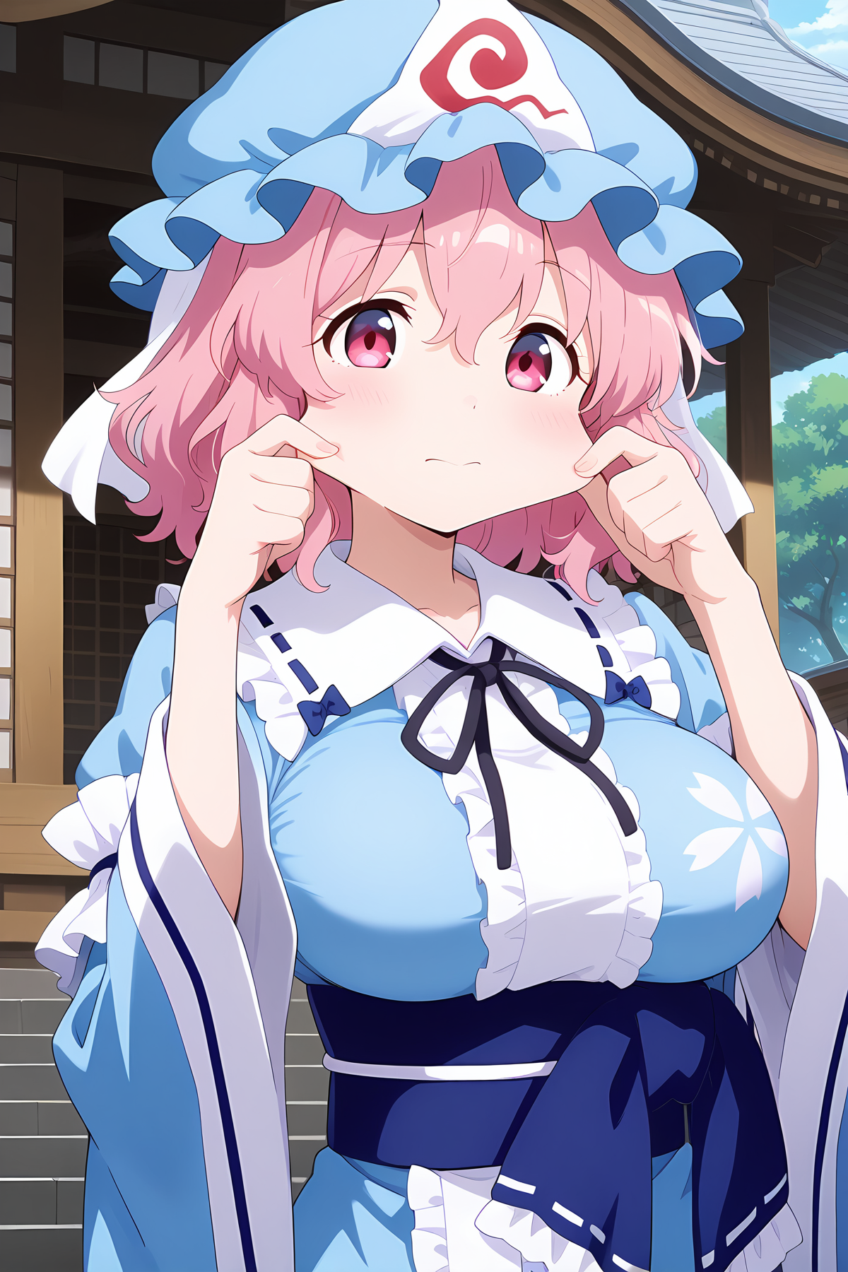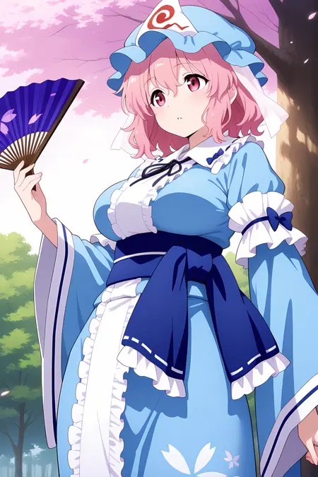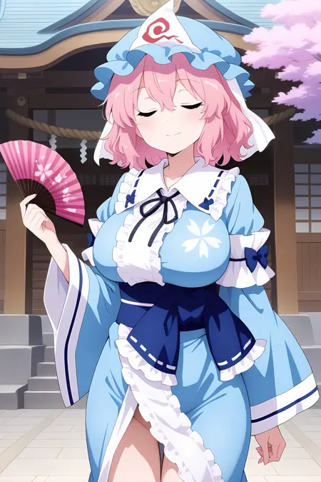 saigyouji yuyuko, 1girl, solo, pink eyes, pink hair, short hair, medium large breasts,
