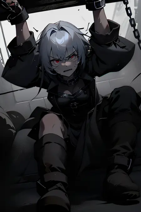 arms up/outstretched arms/spread arms,chained,cuffs,bondage,rope/chain,gag,restrained, bound,bandaged hand,bdsm,spread legs,