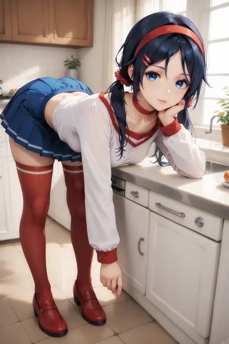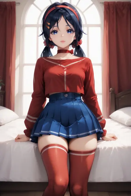 Outfit Prompts : red hairband, hair ornament, skirt, hairclip, shirt, long sleeves, blue skirt, pleated skirt, red choker, scrunchie