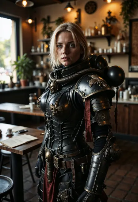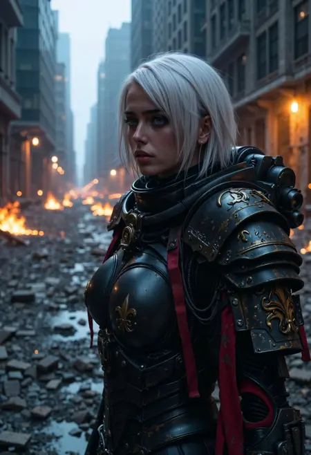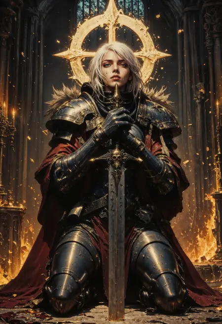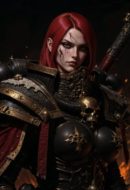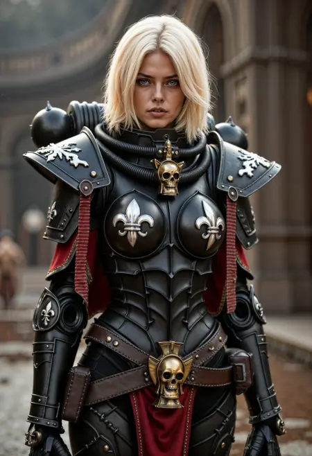このLoRAはFLUX.1[dev]用です。Warhammer 40Kの世界から「戦闘修道女」のパワーアーマーをキャラクターに与えるために作られています。