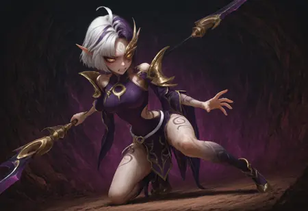blade dancer \(summoners war\), vereesa \(summoners war\), facial tattoo, mask over one eye, two-tone hair, white hair, purple hair, medium breasts, pointy ears, skinny, body tattoo, short hair, ahoge, yellow eyes, pauldrons, white belt, dress, purple dress