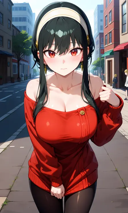 yor briar,红眼睛,黑发,短发带长发绺,侧发,金色耳环,白色发带,红色毛衣,长袖,露肩,裸露肩膀,黑色连裤袜,锁骨