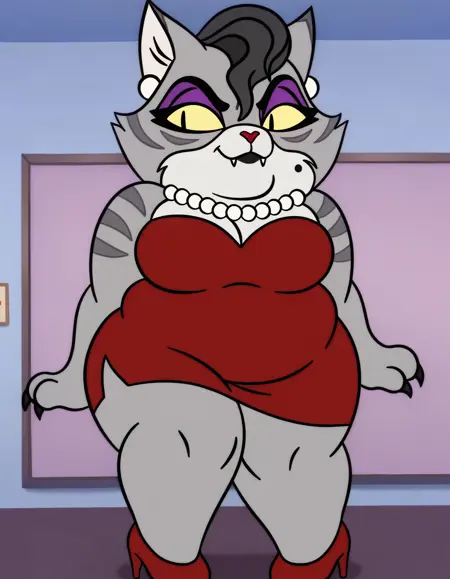 fat,female,mature cat,fur coat,red dress,red high heels,pearl necklace,black hair,lipstick,eyeshadows