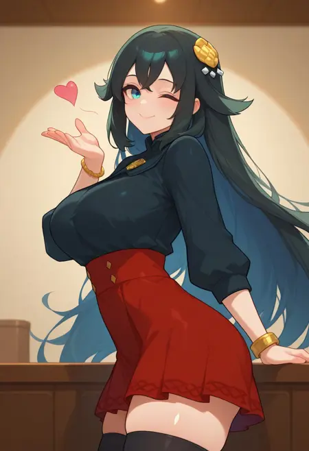 Normal look: black hair, green eyes, sweater dress, white gloves, white thighhighs, hair ornament