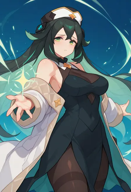 Meteor outfit: black hair, green highlights, green eyes, black dress, coat, bare shoulders, hats