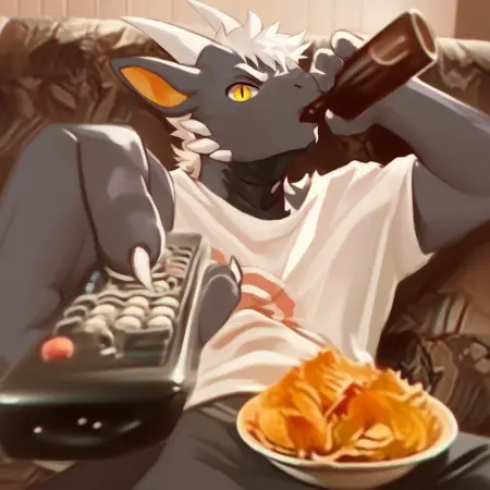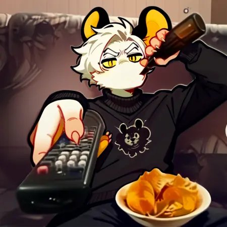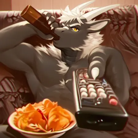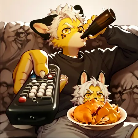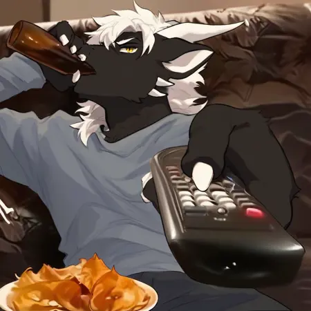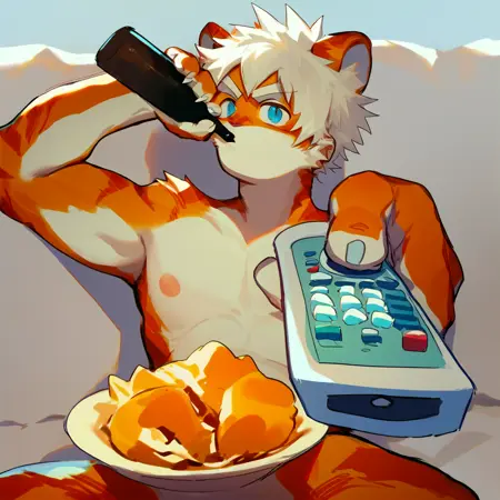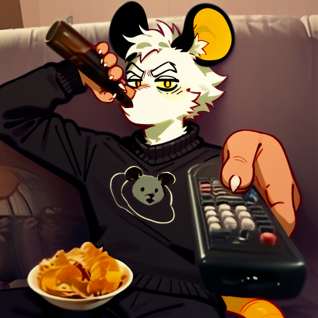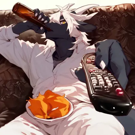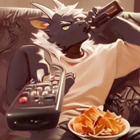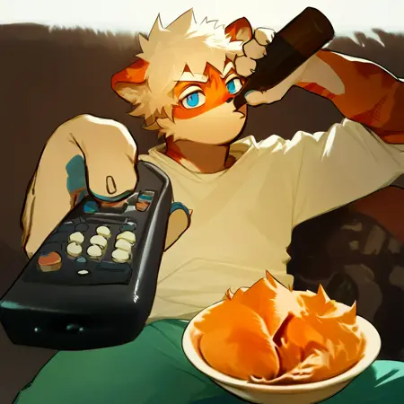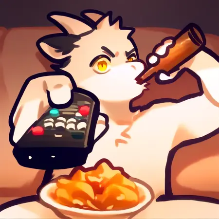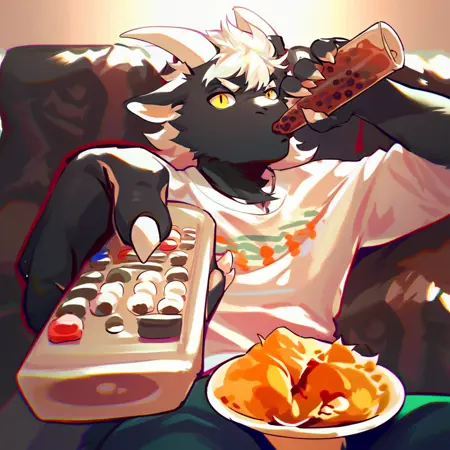 mikus-concept, lounging, reclined, drinking, remote control, bottle, chips, raised brow,
