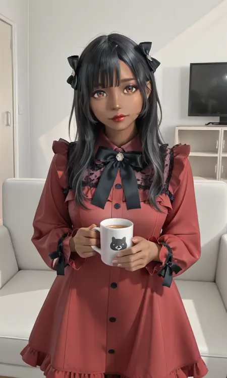1woman,dark-skinned female,long hair,black hair,brown eyes,red lips,gold necklace,green gemstone,strapless dress,red dress,short dress