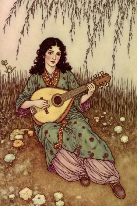 - 이 페르시아 시집을 위한 Dulac의 일러스트는 생생하고 보석 같은 색채로 그 시의 신비롭고 서정적인 분위기를 잘 포착했습니다.