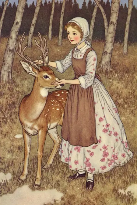 래크헴과 달리, Dulac은 단순하고 거의 미니멀리즘에 가까운 스타일에서 아르 누보까지 다양한 스타일을 사용했습니다(이것이 이 LoRA가 그의 스타일을 래크헴 LoRA만큼 정확하게 구현하지 못하는 이유 중 하나입니다). Dulac은 인물 윤곽을 펜으로 강조하는 작업 없이 수채화와 아크릴화만을 거의 전적으로 사용했기 때문에, 그의 그림은 래크헴의 더 선명한 스타일보다 부드럽고 초월적인 분위기를 띱니다. 이 LoRA는 래크헴의 일러스트레이션과 더 유사한 그의 좀 더 '고전적인' 초기 작품을 기반으로 학습되었습니다.