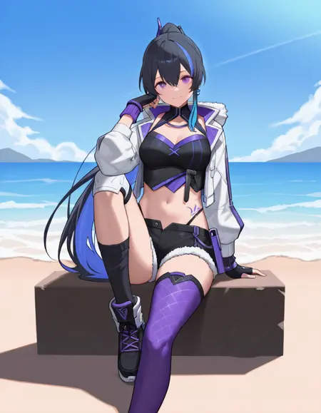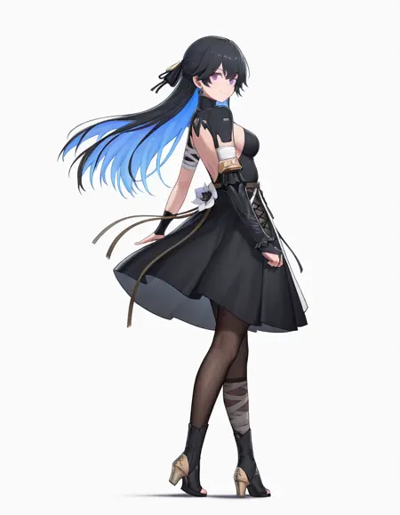 long hair, black hair, blue hair, purple eyes, ponytail,streaked hair,
