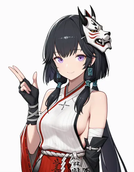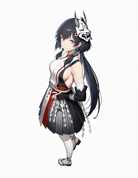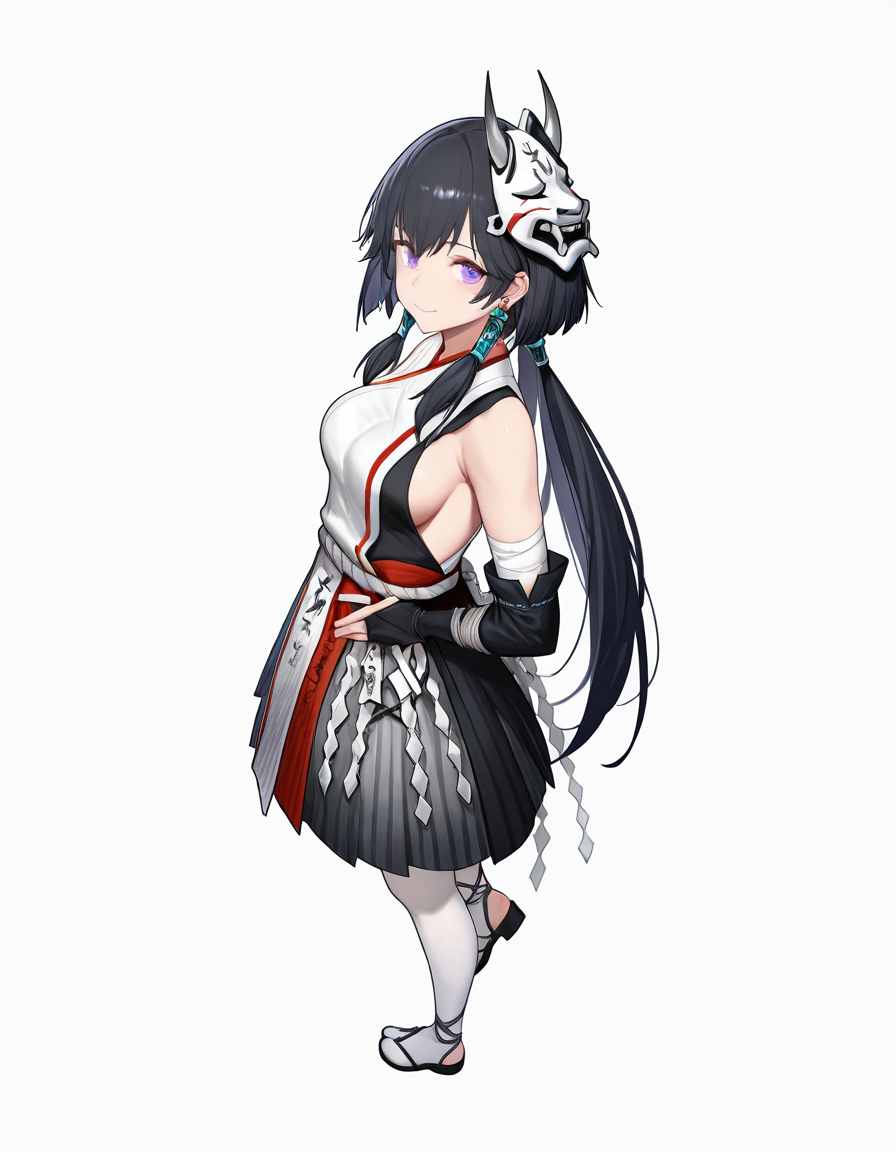 VoxSolaris, VS_japanese_clothes, VS_detached_sleeve, sleeveless kimono, VS_hair_ornament, bandage, bandaged arm, VS_rope_belt, fingerless gloves, bandages, uneven gloves, VS_gloves, VS_mask, oni mask, mask on head, VS_pantyhose, white pantyhose, VS_sandals, VS_skirt, two tone skirt,