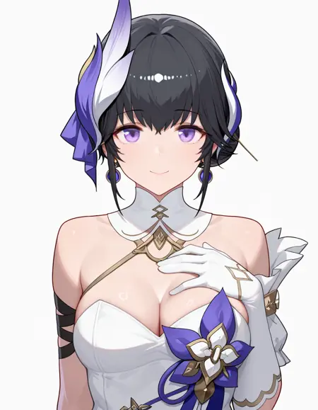 black hair, purple eyes, short hair, single hair bun