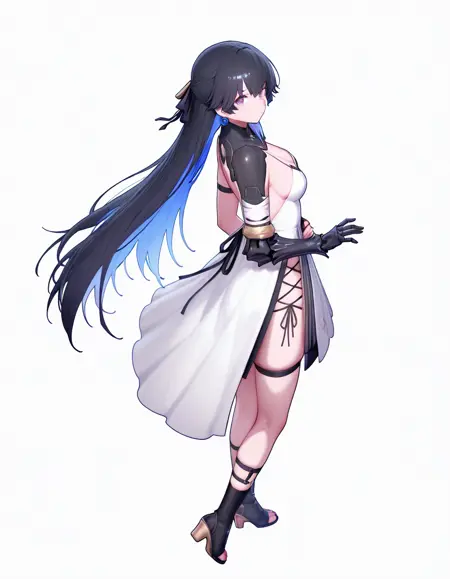 CappricioWhite, wht_hair_ornament, wht_mechanical_arm, asymmetrical gloves, wht_glove, fingerless glove, single glove, wht_dress, wht_high_heels, wht_socks, toeless footwear, wht_thigh_strap