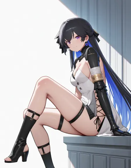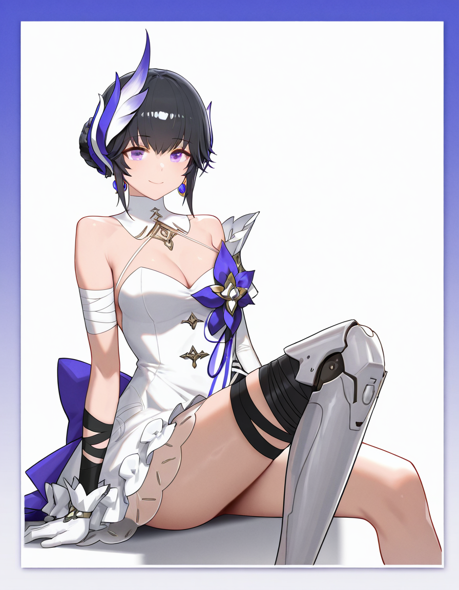 Pianissimo,def_two-tone_dress, def_feather_hair_ornament, def_gloves, def_earring, def_flower_hair_ornament, def_waist_cape, def_mechanical_legs, def_high_heel_knee_boots, def_bandages_around_arms