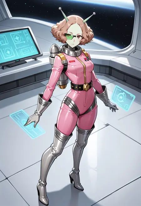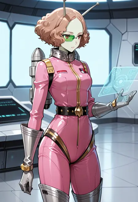 p5haru-cognitive, spacesuit, pink bodysuit, belt, studded belt, gloves, thigh boots, silver boots, alien, silver gloves, jetpack, scouter, holographic interface, antennae, colored skin, green skin, science fiction, cosplay, alternate outfit,