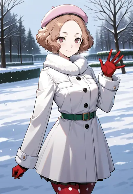 p5haru-wintercas2, beret, pink beret, long coat, thin belt, green belt, gloves, red pantyhose, polka dot legwear, ankle boots, side-zip boots,
