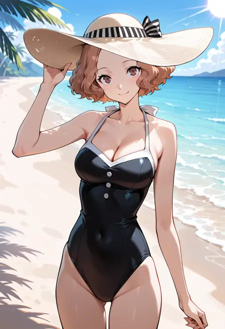 p5haru-strikersswim, black swimsuit, one-piece swimsuit, black one-piece swimsuit, casual one-piece swimsuit, sun hat, hat bow, bow, black bow, black and white striped bow, buttons, white buttons, white hem,