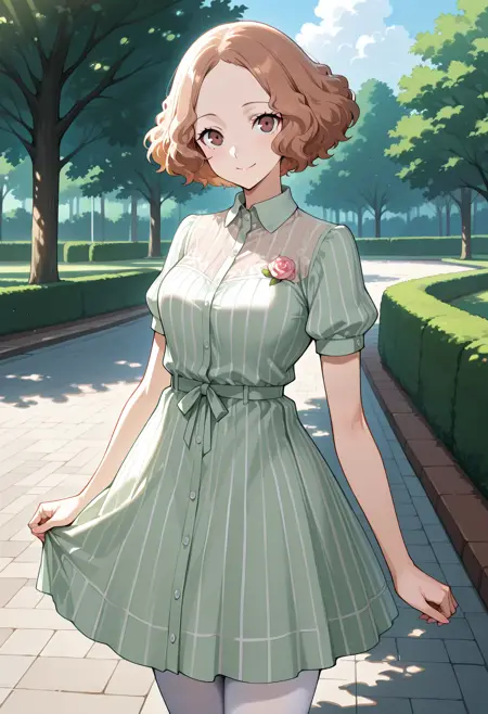 p5haru-summercas, dress, striped dress, light green dress, white collar, pink rose embroidery, short puffy sleeves, white pantyhose,