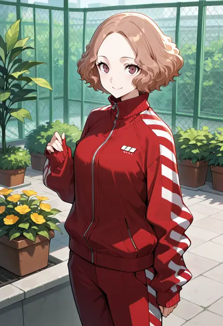 p5haru-track, track suit, red jacket, red pants, stripes, striped sleeves, sleeves past wrists, long sleeves, zipper, striped pants, white footwear, sneakers,
