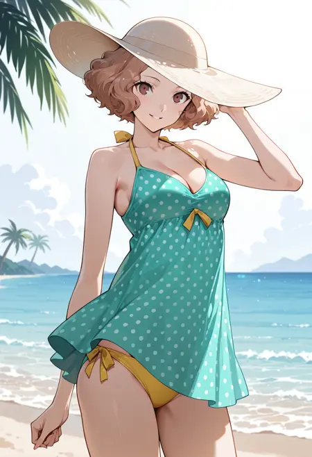p5haru-swim, sun hat, dress swimsuit, dress, aqua dress, tankini, polka dot tankini, aqua tankini, halterneck,