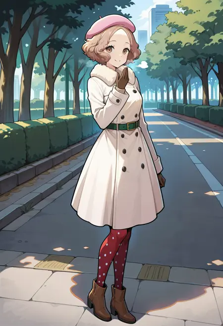 p5haru-wintercas2, beret, pink beret, long coat, thin belt, green belt, gloves, red pantyhose, polka dot legwear, ankle boots, side-zip boots,