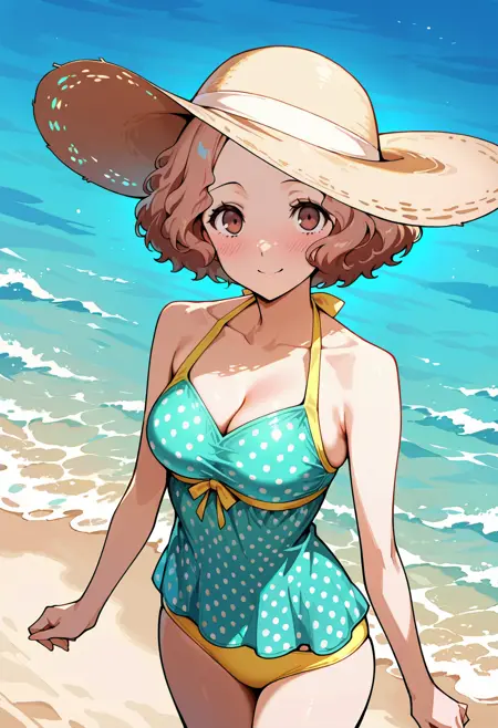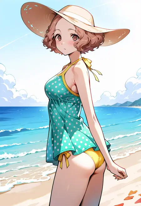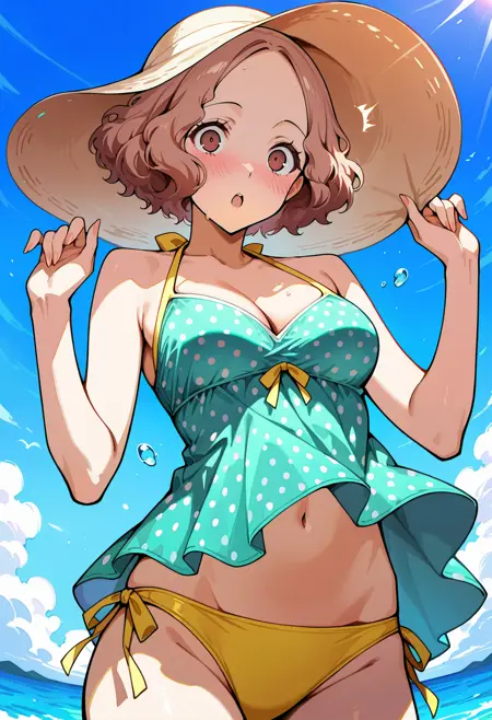 p5haru-swim, sun hat, dress swimsuit, dress, aqua dress, tankini, polka dot tankini, aqua tankini, halterneck,