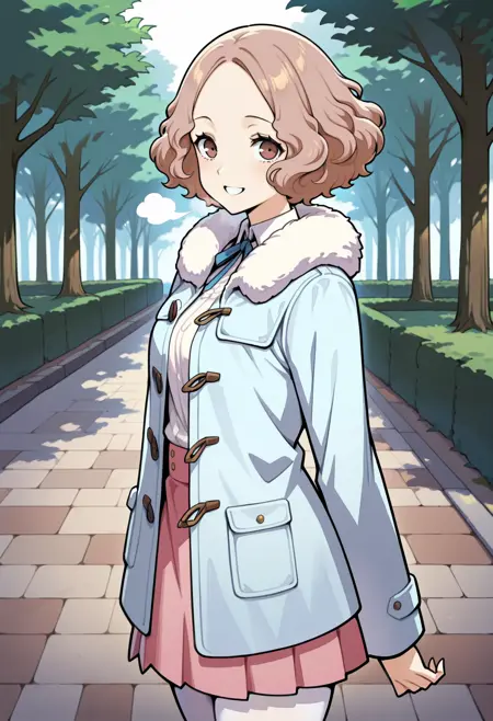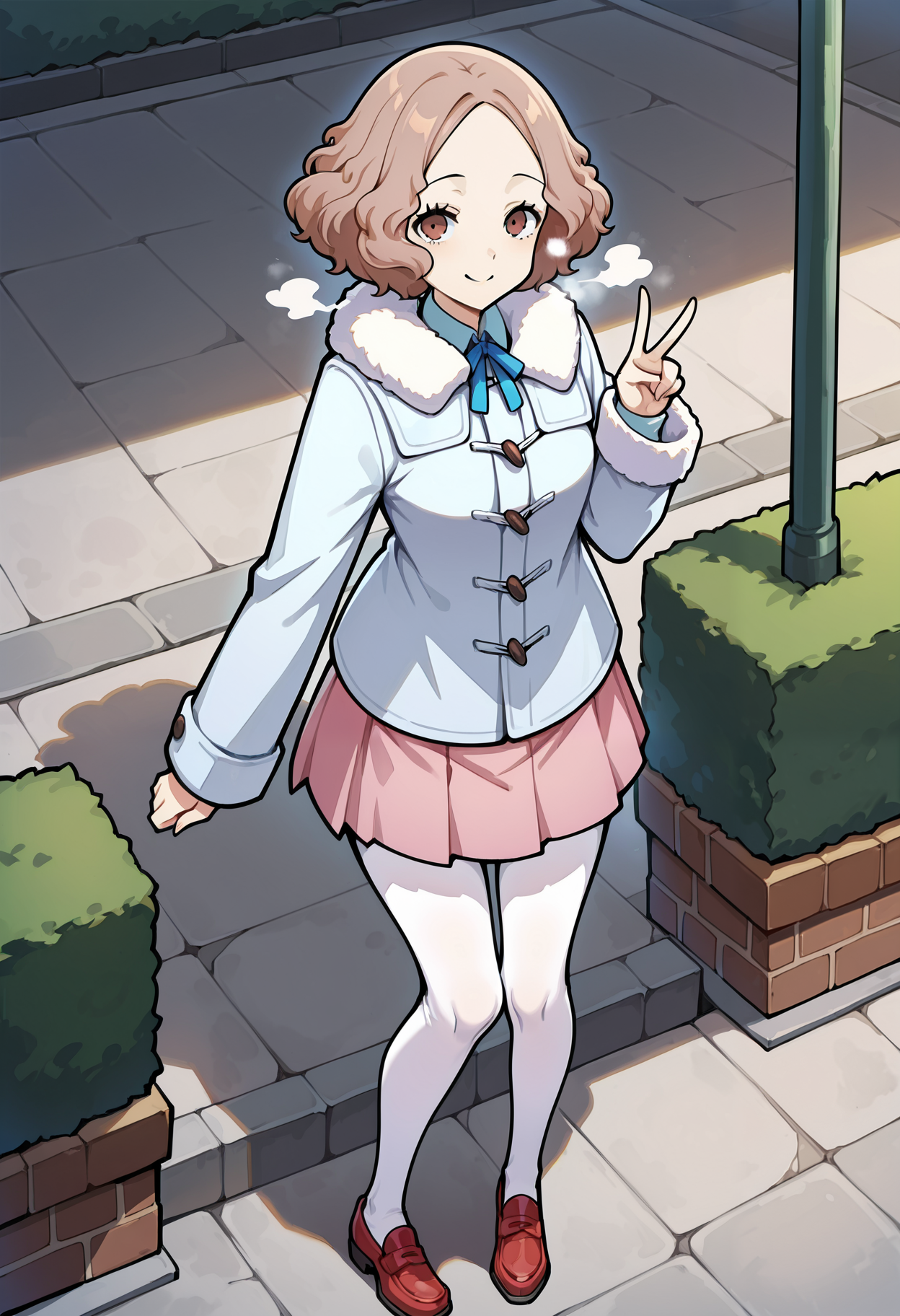 p5haru-wintercas, fur trim, fur-trimmed jacket, duffle coat, neck ribbon, pink skirt, white pantyhose, pink skirt, loafers, red footwear,