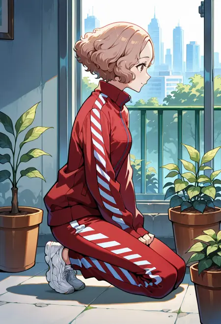 p5haru-track, track suit, red jacket, red pants, stripes, striped sleeves, sleeves past wrists, long sleeves, zipper, striped pants, white footwear, sneakers,