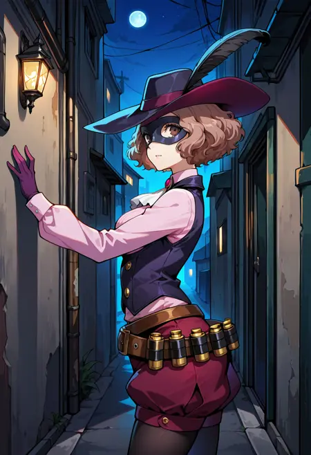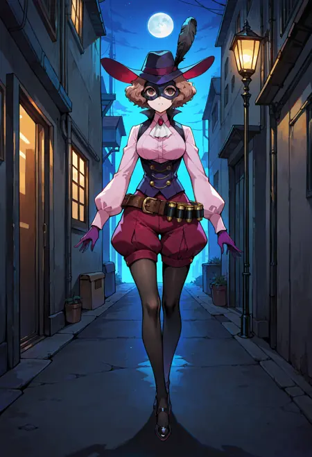 p5haru-noir, hat, hat feather, domino mask, ascot, pink shirt, long sleeves, vest, underbust, magenta shorts, puffy shorts, legwear under shorts, black pantyhose, purple gloves, belt, bandolier,