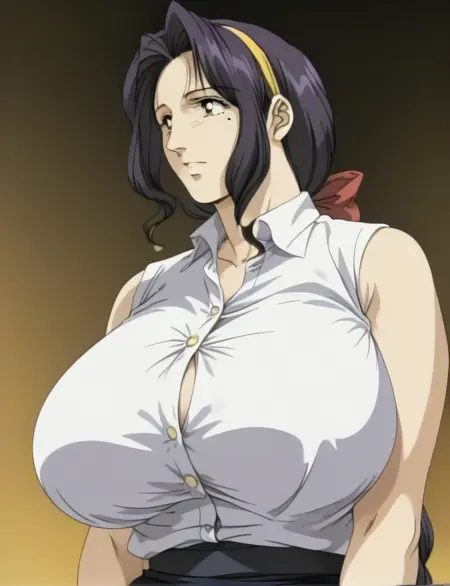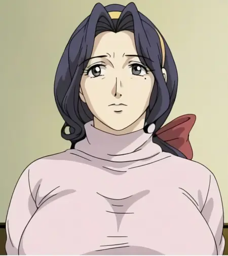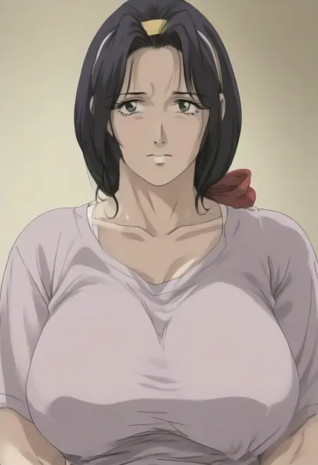 misako,独处,大乳房,女性,黑发配红色发结,中分发线,黄色发带,长发,((动漫截图)),宽下颌,中年女性,成年身材,美丽,