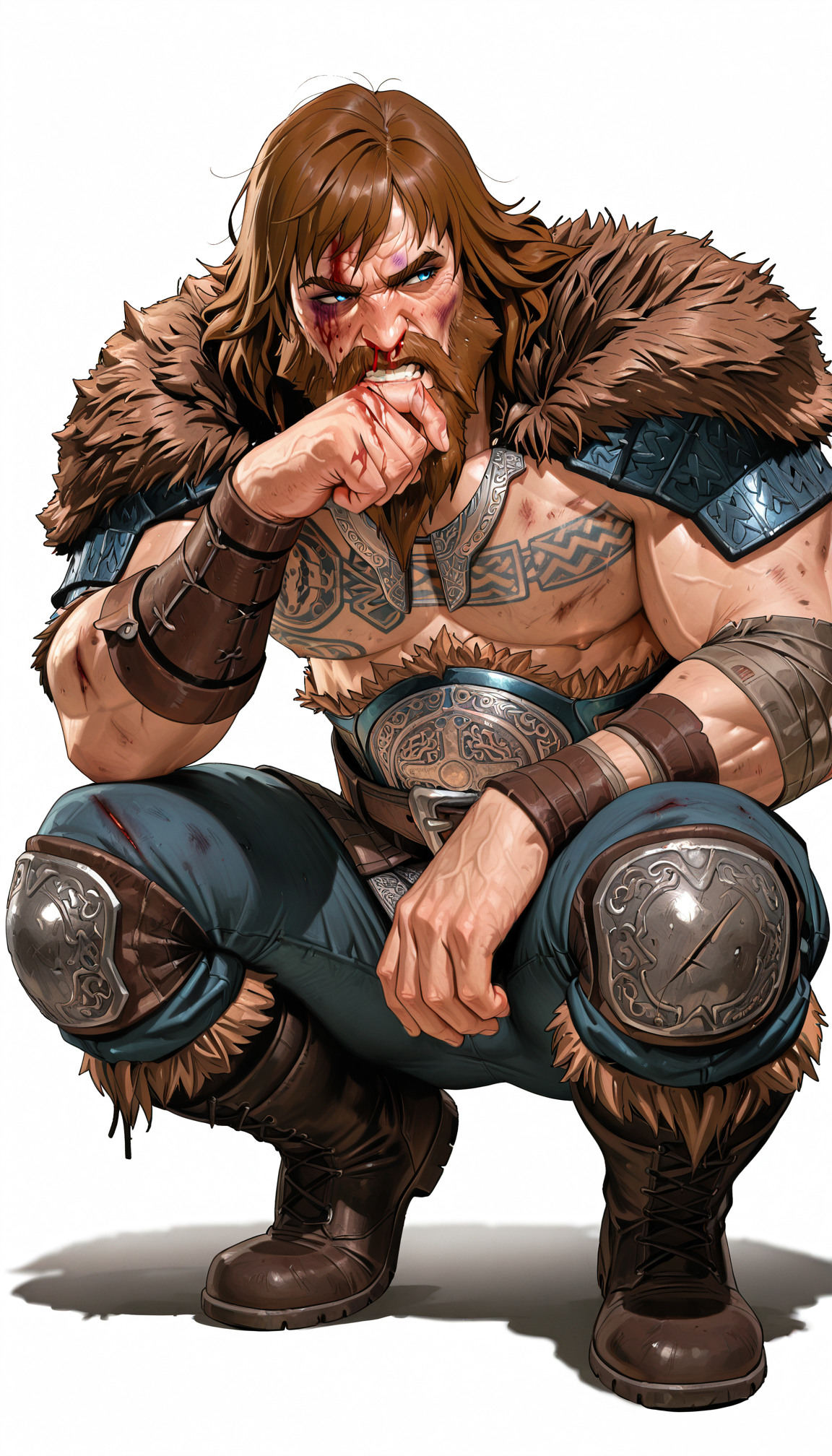 補助プロンプト: 茶色の髪、乱れた髪、青い目、大きな目、(目の下のクマ:0.8)、濃い眉、濃いヒゲ、濃い口ひげ、あごひげ、(しわ:0.8)、しっかりした顎のライン、胸のタトゥー、ネックレス、肩のアーマー、上腕のアーマー、ネックレス、革製の包帯巻きの腕