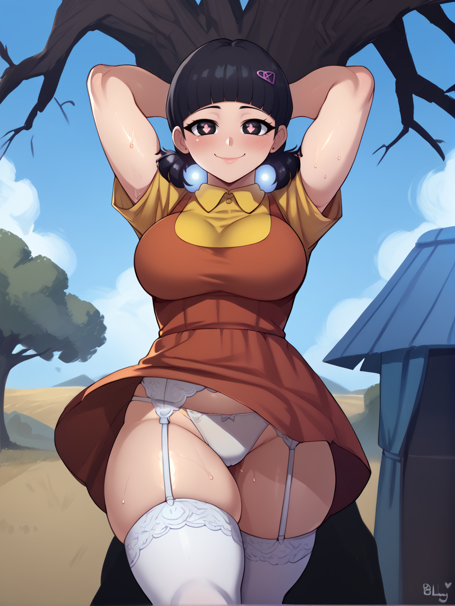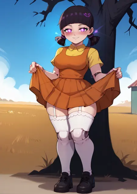 | 训练词汇 | 1girl, black hair, blunt bangs, short hair, twintails, short twintails, hair ornament, purple eyes, symbol-shaped pupil, doll joints, 已复制! shirt, yellow shirt, short sleeves, collared shirt, sleeveless dress, dress, orange dress, orange skirt, short dress, miniskirt, microskirt, skirt, pleated skirt, thighhighs, white thighhighs, garter straps, shoes, brown shoes, 已复制! |