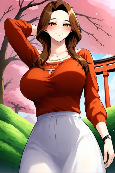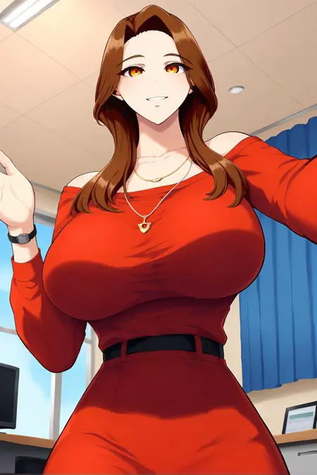 outfit: bare shoulders, collarbone, long sleeves, necklace, off shoulder shirt, office lady, shirt tucked in, wristwatch, high-waist skirt