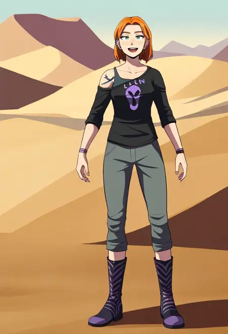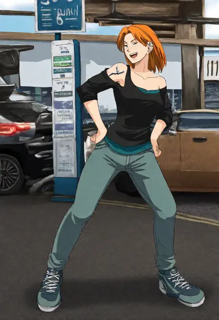 Road 96のZoe。メインプロンプトは「ZoeR96」。顔は「オレンジ色の髪、ほくろ、ピアス、耳のピアス」。服は「片肩出し、肩のタトゥー、黒いシャツ、パンツ」