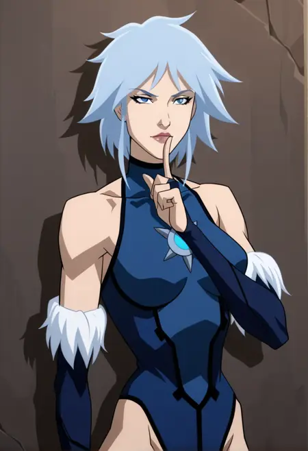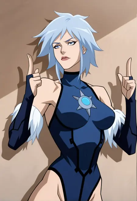 Trigger = aakf, Tags = 1girl, solo, blue eyes, short hair, lips, blue hair, breasts, blue leotard, elbow gloves, fur trim, bridal gauntlets,