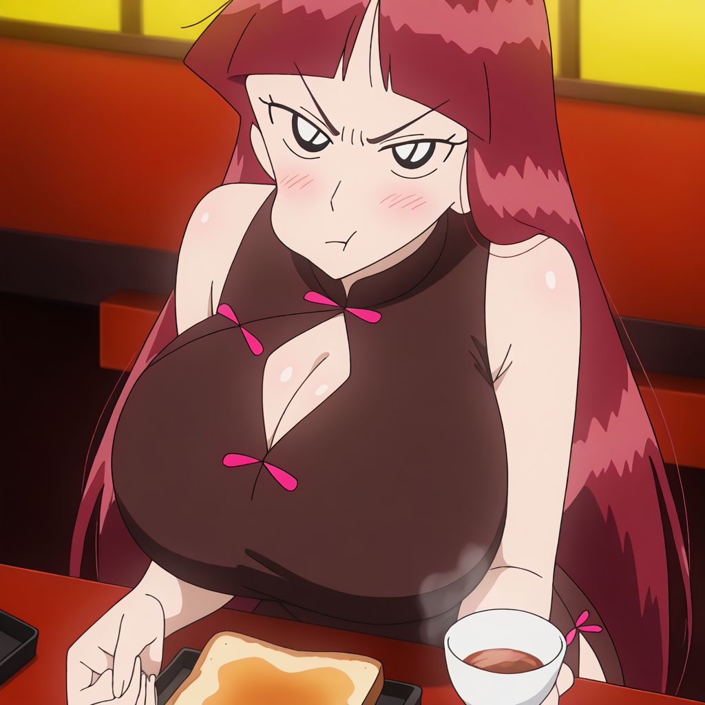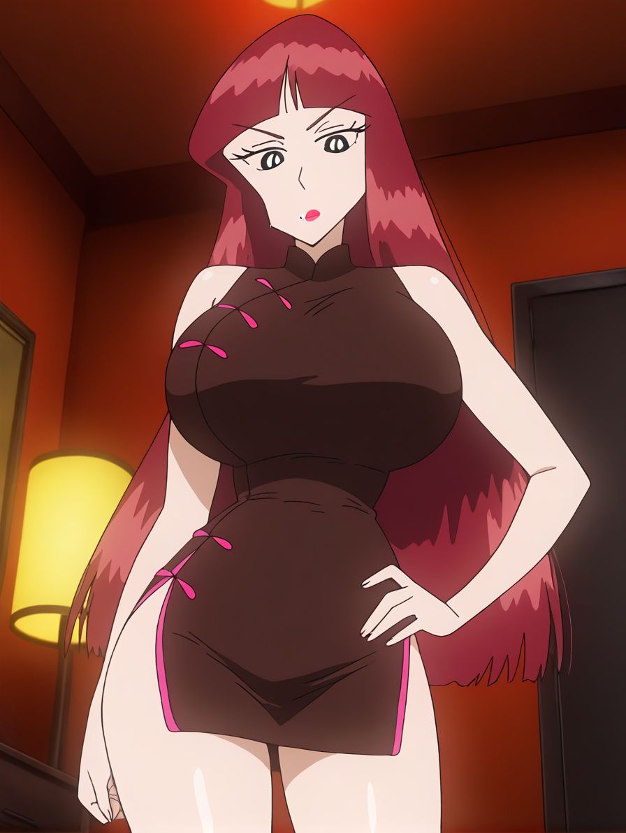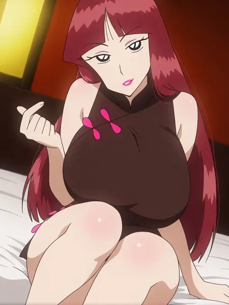 • Trigger word: ranomega, red hair, makeup, mole under mouth, bangs, very long hair,mole under mouth, china dress, bare shoulders, sleeveless,huge breasts,mature female