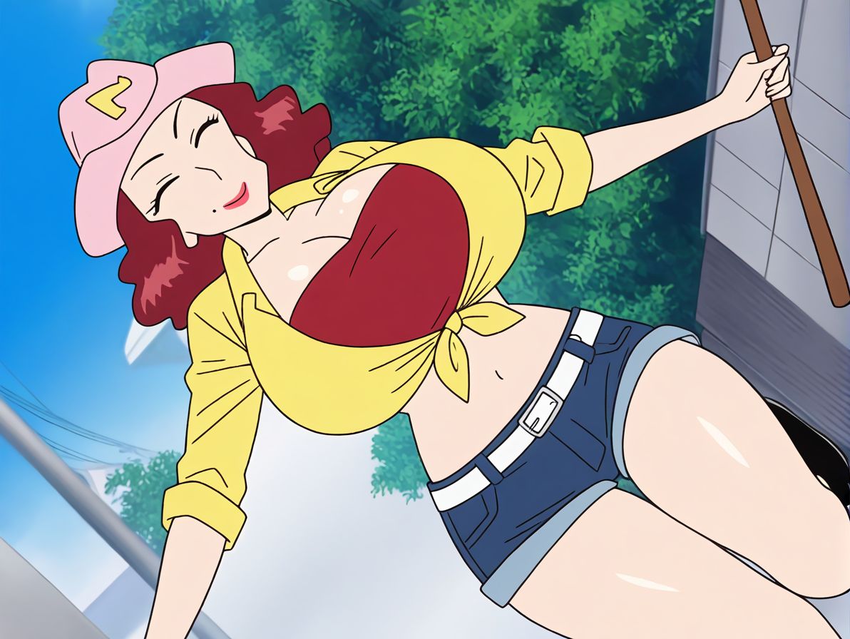 • Suspicious Woman: alternate costume, alternate hairstyle,wavy hair,medium hair,yellow shirt,tied shirt,hat,red tube top,pink headwear,navel,happy,short shorts,denim shorts,boots,belt