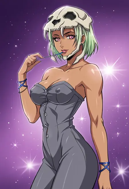 CastraDP,1女孩,单独,深色皮肤女性,薄荷绿发,浅绿发,鲍勃头,粉色眼睛,X形粉色虹膜,嘴唇,头上戴着动物头骨,大号灰色衬衫,大胸,蓝色手镯,粉色鞋子,珠宝,裸露肩膀,棒棒糖,乳沟,宽臀,锁骨处有纹身